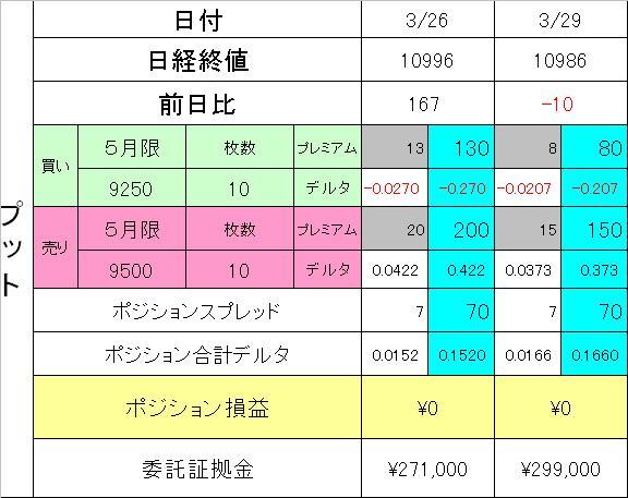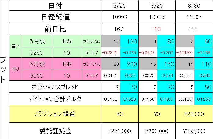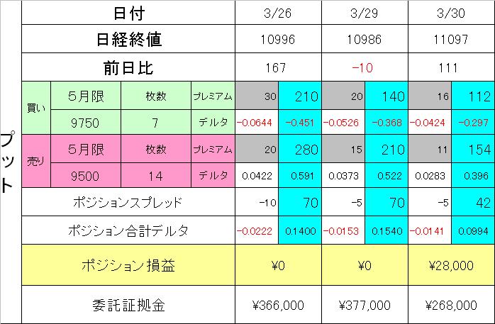 さて、コールでロスカットした分は一つアウトへロールしてスプレッドを新規構築し、デルタ調整ポジションでプットのレシオを積み増しています。