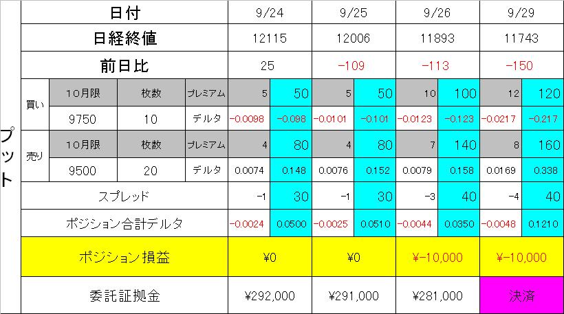 それに伴い、10P9750買いポジも終値決済して、結果-10,000円の損失ですが仕方ありません。。。