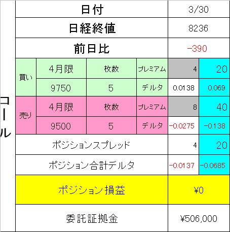 懸念していたコール9750売りポジは、ロスカットポイントまでは来てないのですが、デルタがあまりにも大きなマイナスになりすぎてヘッジがかけにくいのと、ビビッてしまったのとで思い切ってロスカットして逃げました^^;;