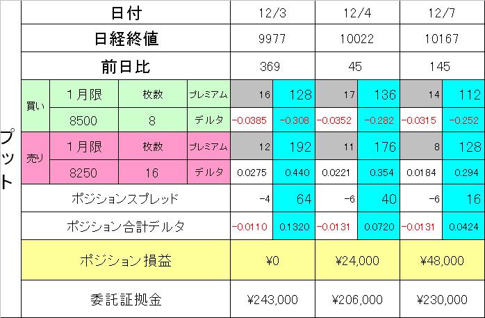 ここの所の上げのスピードにちょっとビビッていますが、プット側でもヘッジのスプレッドを組んでいますので、少々の上げには何とか耐えられると思います。