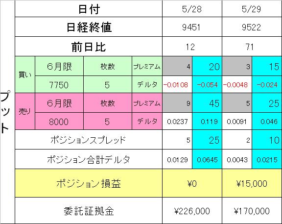 さらにプット新規を追加で若干デルタマイナスで終了です。。。